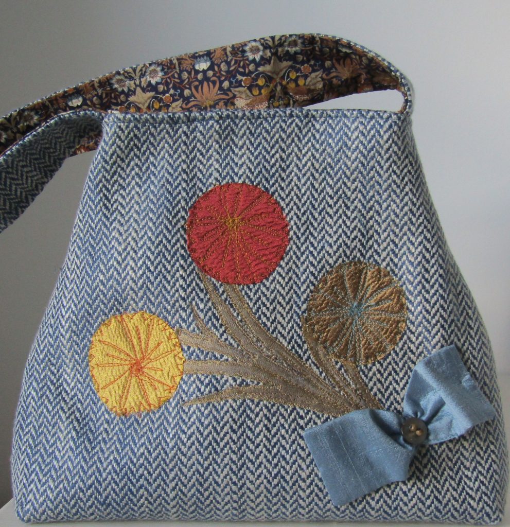 All my bags have individually designed details using many different techniques. I first choose the matching materials for the bag and then decide on my colours and techniqes for the decoration and create my design. No two bag decorations are completely the same. Colour co-ordination is of huge importance to my design and I take great inspiration from my many collected fabrics/trims and threads that I have available, spending time matching them all together.
